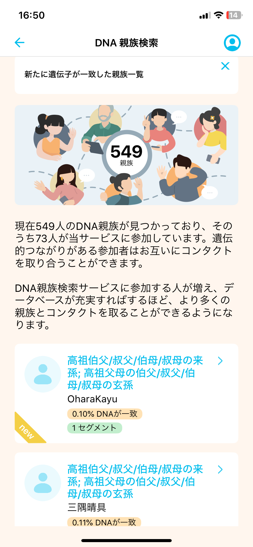 自身の情報を共有することで遺伝子型が一致する遠い親戚を検索し、つながることができます。