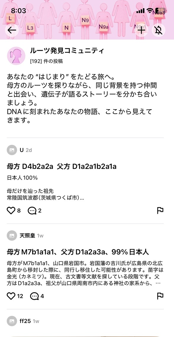 ご自身のDNAタイプが近い人たちの投稿が見ることができます。