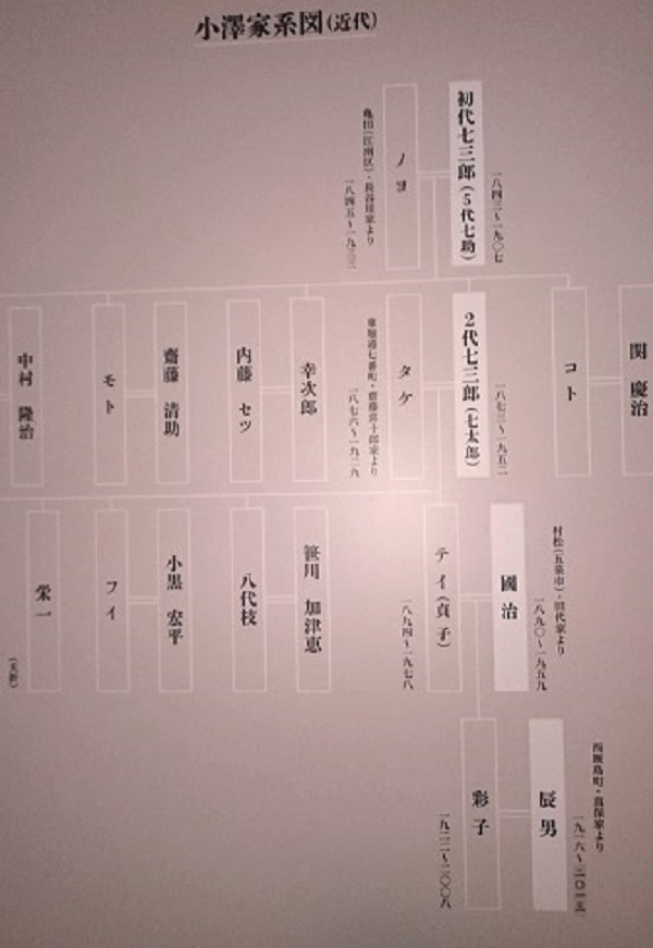 小澤家の家系図です。初代七三郎(1843~1907)は、回船業を営み近代小澤家の基礎をつくり、2代目七三郎が新潟の三代財閥の一つ斉藤家の娘・タケと結婚し、小澤家の商いをさらに繁栄させていきました。